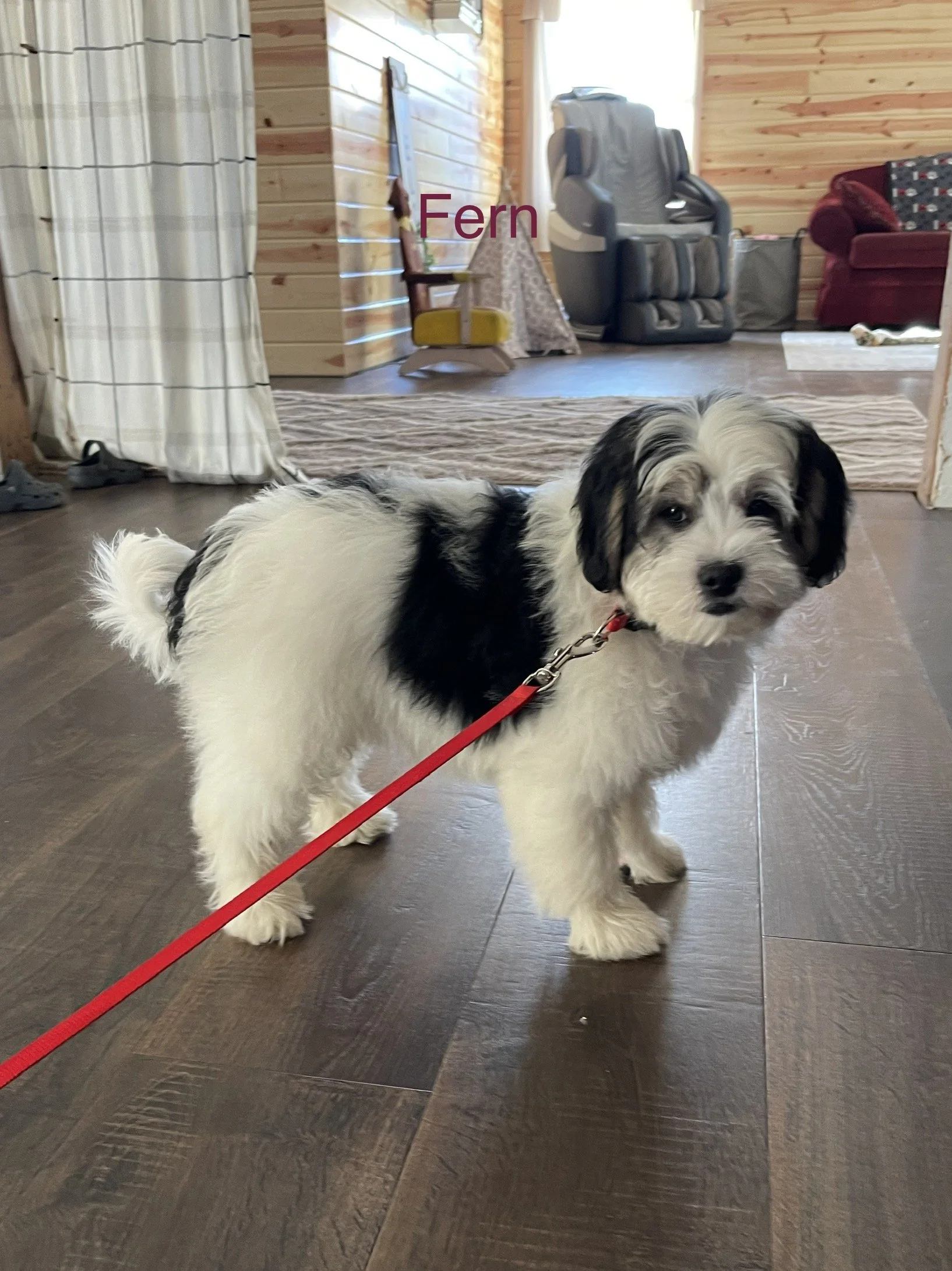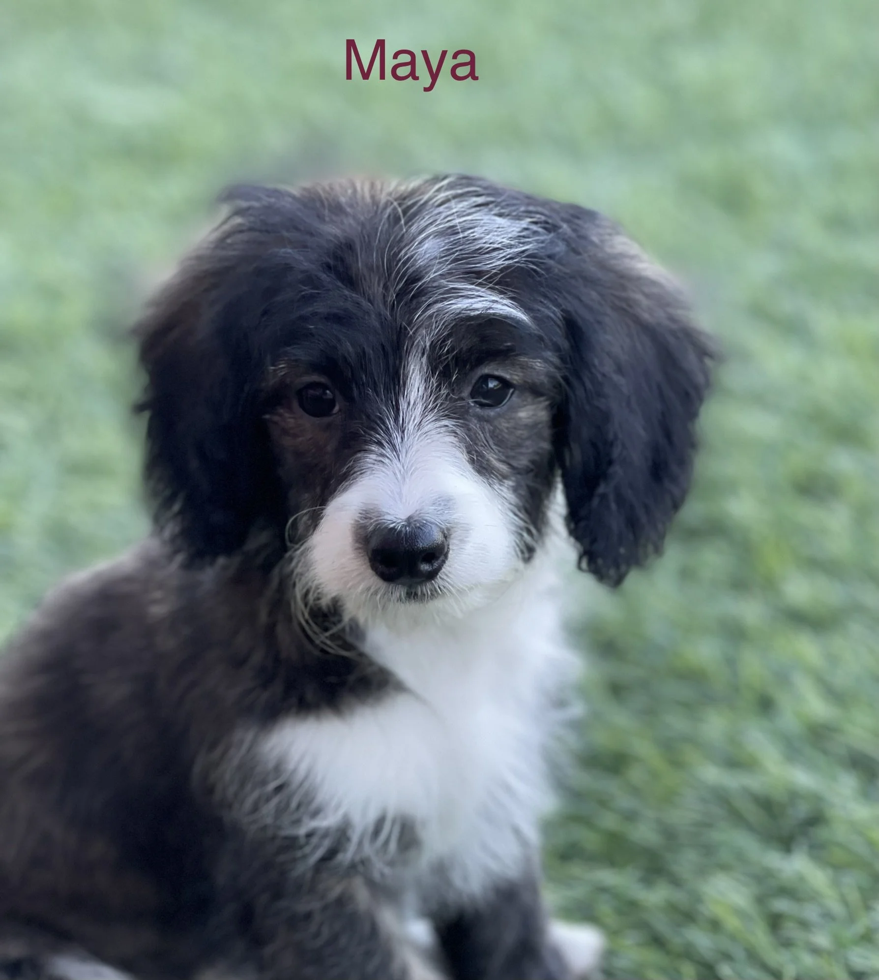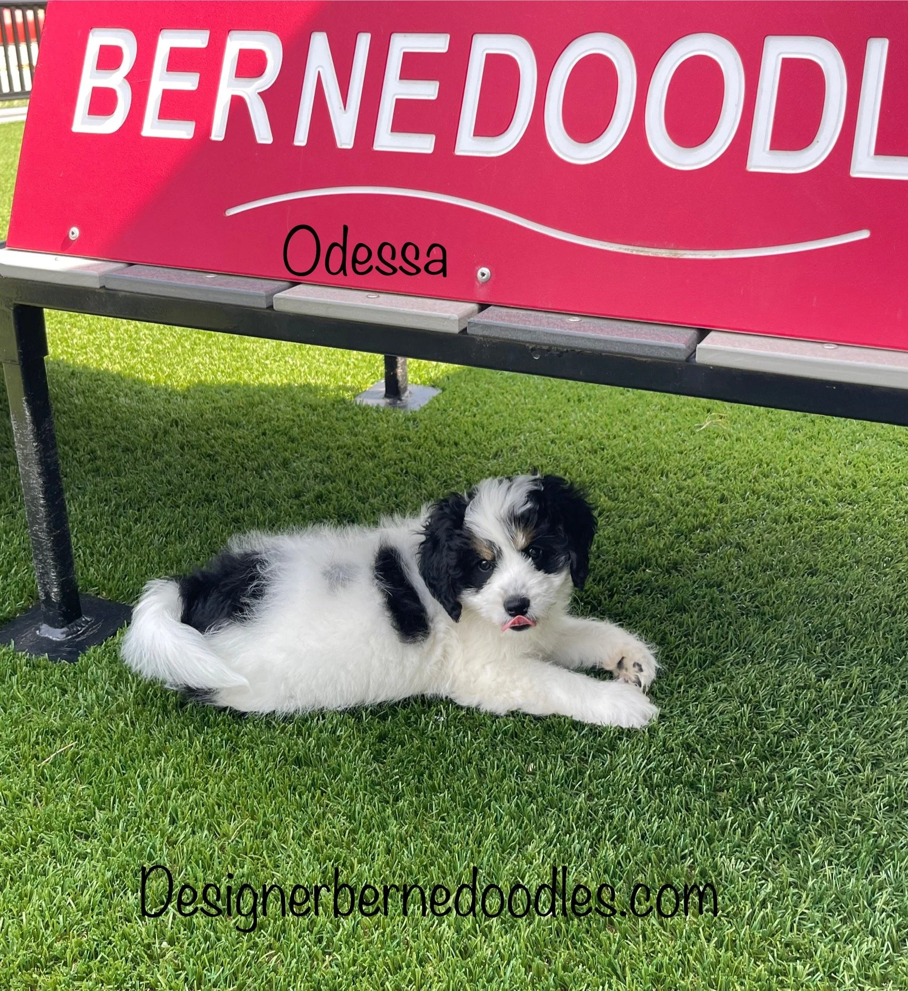 Odessa 0149 has found her forever home with Brianna Rajchel from WI , She is a gorgeous Black & white Tri Color F1b Tiny / Toy Bernedoodle born Tuesday June 24th 2025, She will be 8 weeks old and ready to go home as early as Tuesday August 19th. Her parents are Fiona & Banjo. Fiona weighs 23lbs and Banjo weighs 17lbs. Estimated weight is between 20& 30 Lbs full grown.