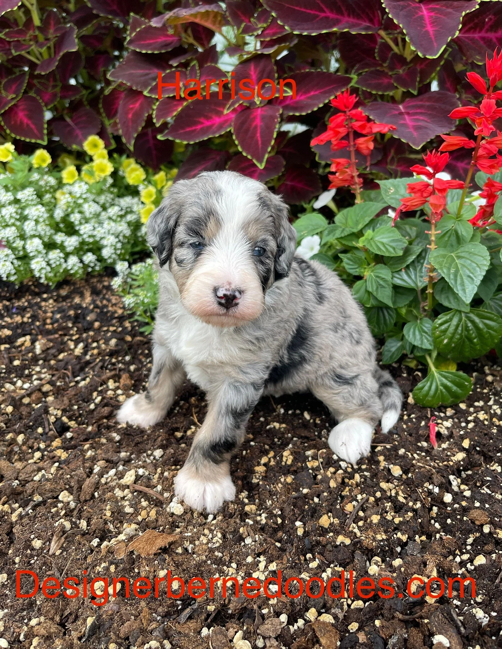 Cooper was Harrison 3155 has found his forever home with Holly Wikfors from Sarasota FL is a handsome Blue Merle F1b Tiny / Toy Bernedoodle born Saturday June 21st 2025, He will be 8 weeks old and ready to go home as early as Saturday August 16th. His parents are Daisy & Prince. Daisy weighs 40lbs and Prince weighs 10lbs. Estimated weight is between 15 & 30 Lbs full grown.