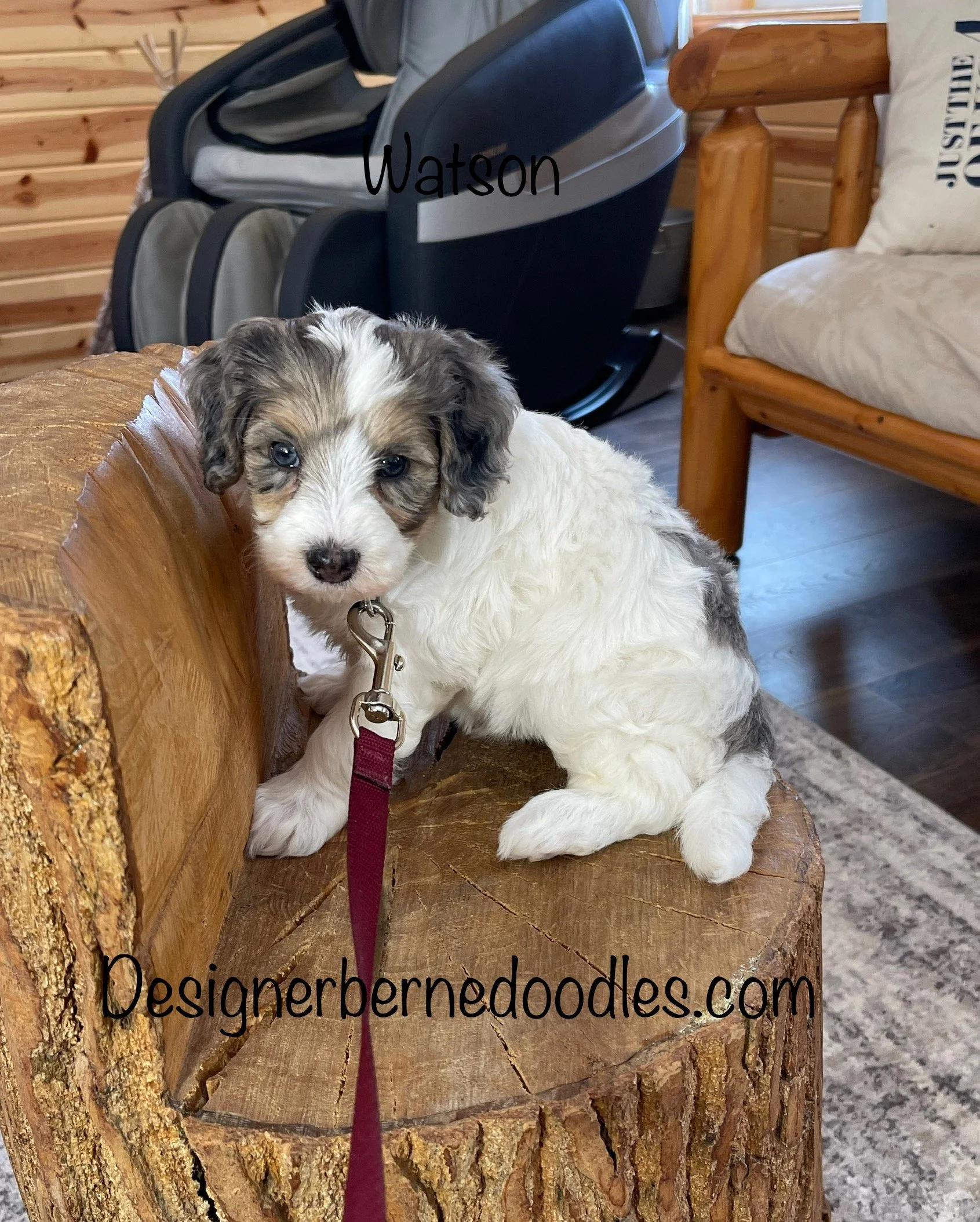Watson 6552 has found his forever home with Ken & Christina Verdeyen from New Lenox IL. He is a handsome Blue Merle & White F1b tiny Bernedoodle born Friday Dec 19th 2025, He will be 8 weeks old and ready to go home as early as Friday Feb 13th. His parents are Daisy & Prince. Daisy weighs 37lbs and Prince weighs 10lbs. Estimated weight is between 15 to 30 Lbs full grown.