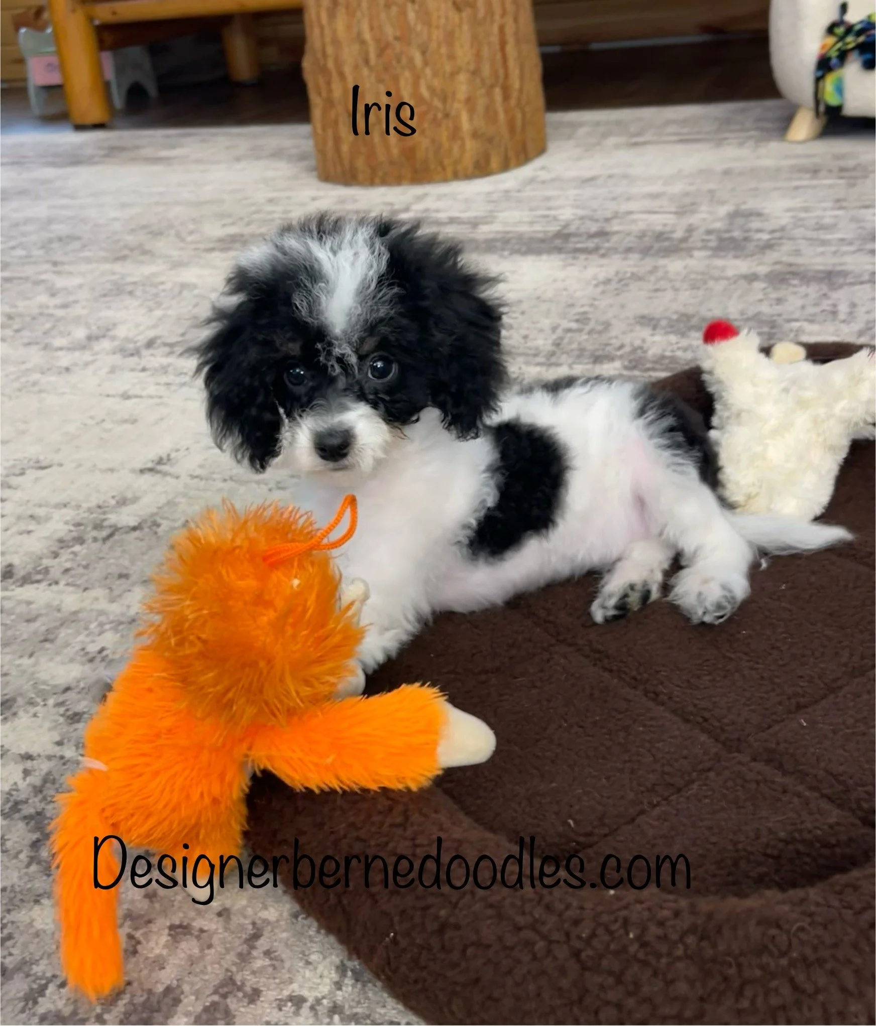 Iris 8000 is a gorgeous Black & white Tri Color F1b Tiny / Toy Bernedoodle born Wednesday Dec 10th 2025, She will be 8 weeks old and ready to go home as early as Wednesday Febuary 4th. Her parents are Queen & Jimmy. Queen is an F1 Mini Bernedoodle who weighs 25Lbs and Jimmy is a mini poodle who weighs 13lbs. Estimated weight is between 15 & 25Lbs full grown. She is priced @ $3500. To place a $500 deposit to reserve her text, or call Ryan @ 2174601313.