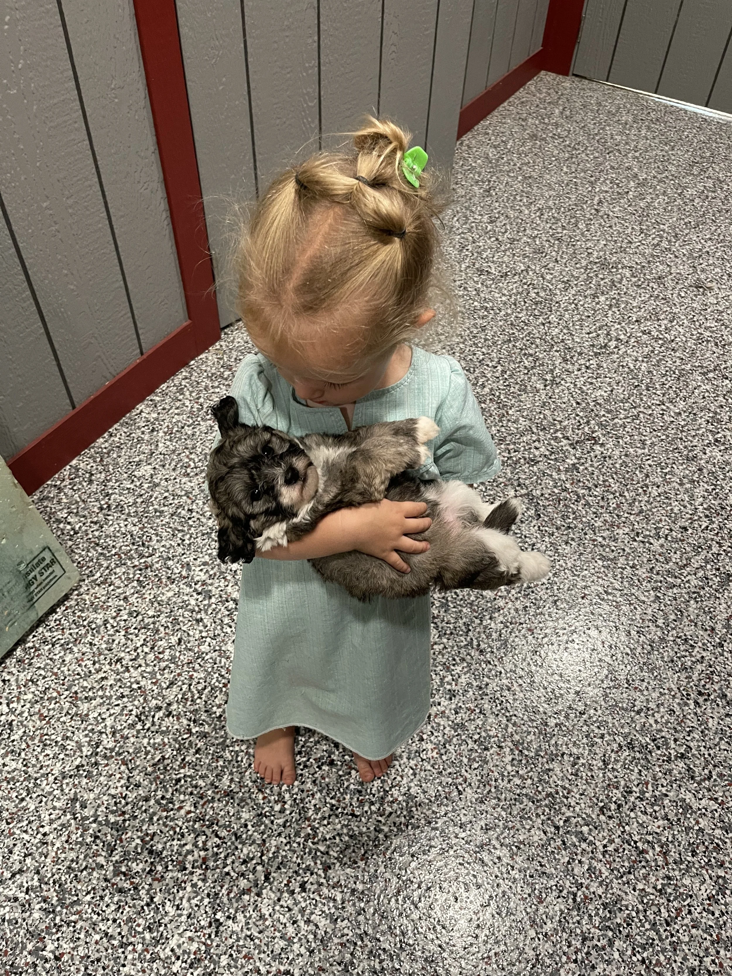 Ellie is the cutest with her BIG Blue EYES! She is so sweet and does so well with the children! She is a calmer puppy overall but still likes to play and not miss out on the fun! She has been referred to as looking like Snoopy! I can kinda see that! She is started on her leash , crate and potty training! She is using a doggy door to go potty outside already! To reserve her or schedule a visit or request a video text or call Ryan @ 2174601313.