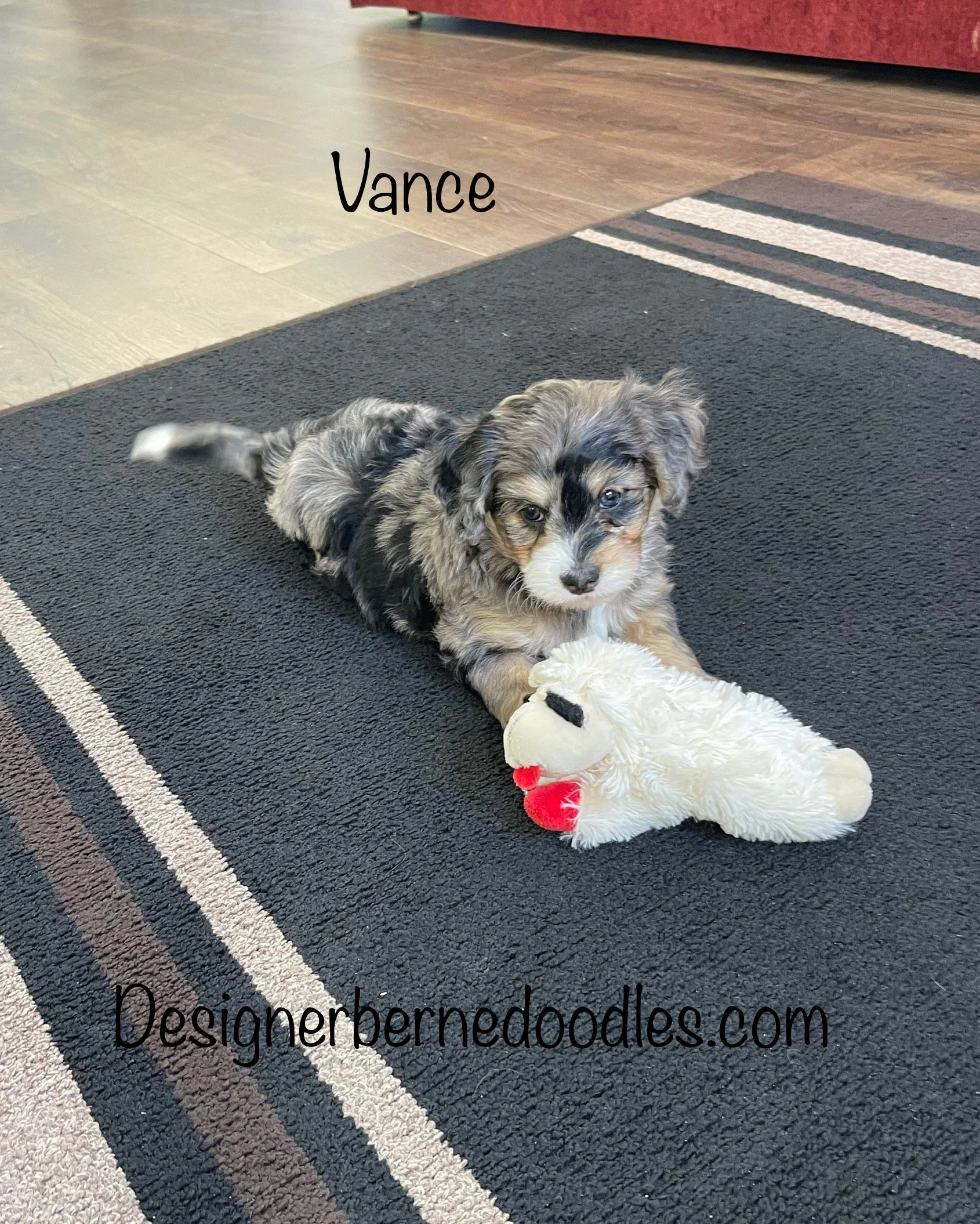 Vance 7226 has found his forever home with Carl Mason & family from Philadelphia PA, He is a handsome Blue Merle F1b tiny Bernedoodle born Friday Dec 19th 2025, He will be 8 weeks old and ready to go home as early as Friday Feb 13th. His parents are Daisy & Prince. Daisy weighs 37lbs and Prince weighs 10lbs. Estimated weight is between 15 to 30 Lbs full grown.