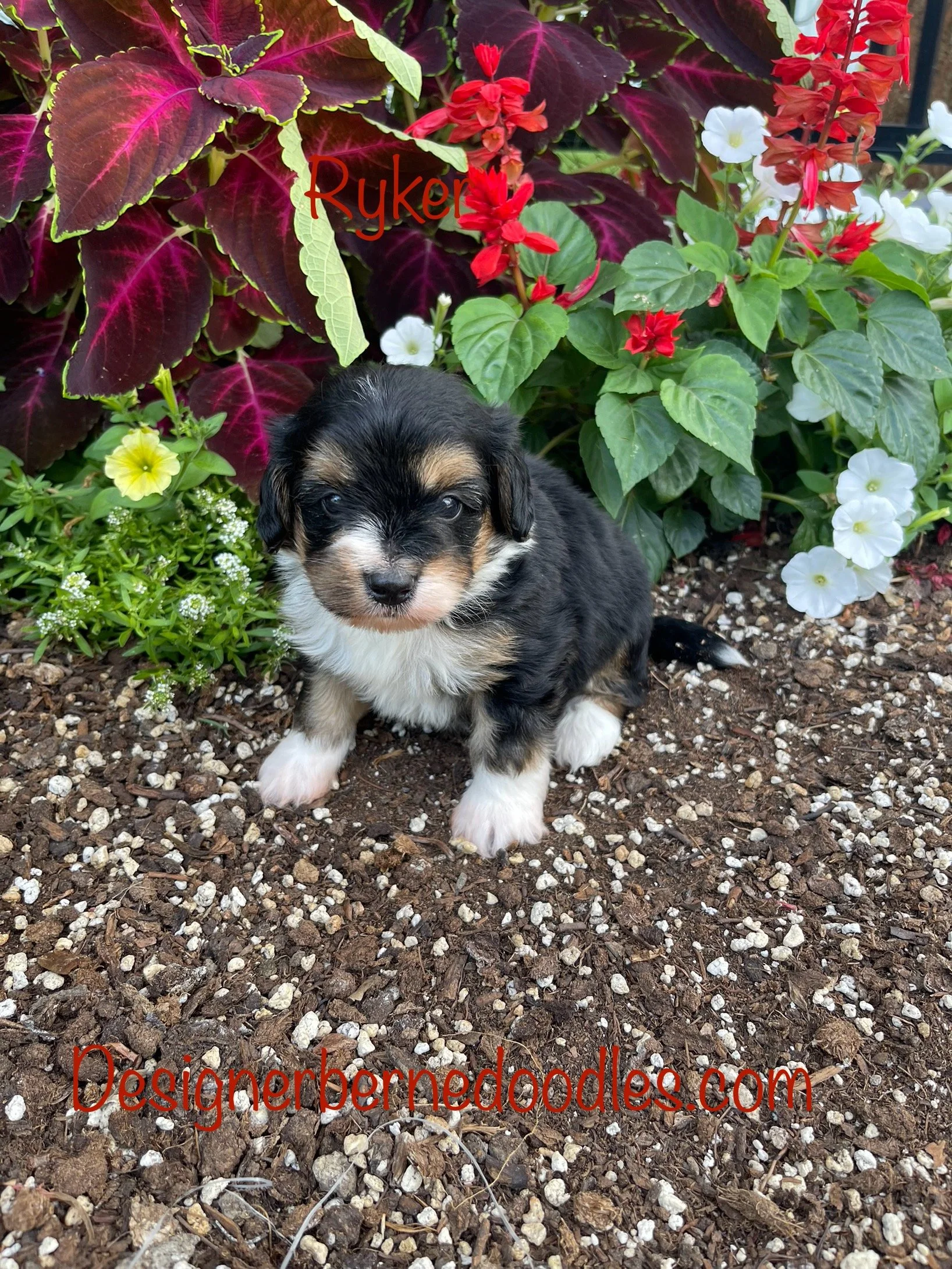 Ryker 0874 has found his forever home with Pam Maher & family from Rockford IL, He is a handsome Tri Color F1b Tiny / Toy Bernedoodle born Tuesday June 24th 2025, He will be 8 weeks old and ready to go home as early as Tuesday August 19th. His parents are Fiona & Banjo. Fiona weighs 23lbs and Banjo weighs 17lbs. Estimated weight is between 15 & 30 Lbs full grown.