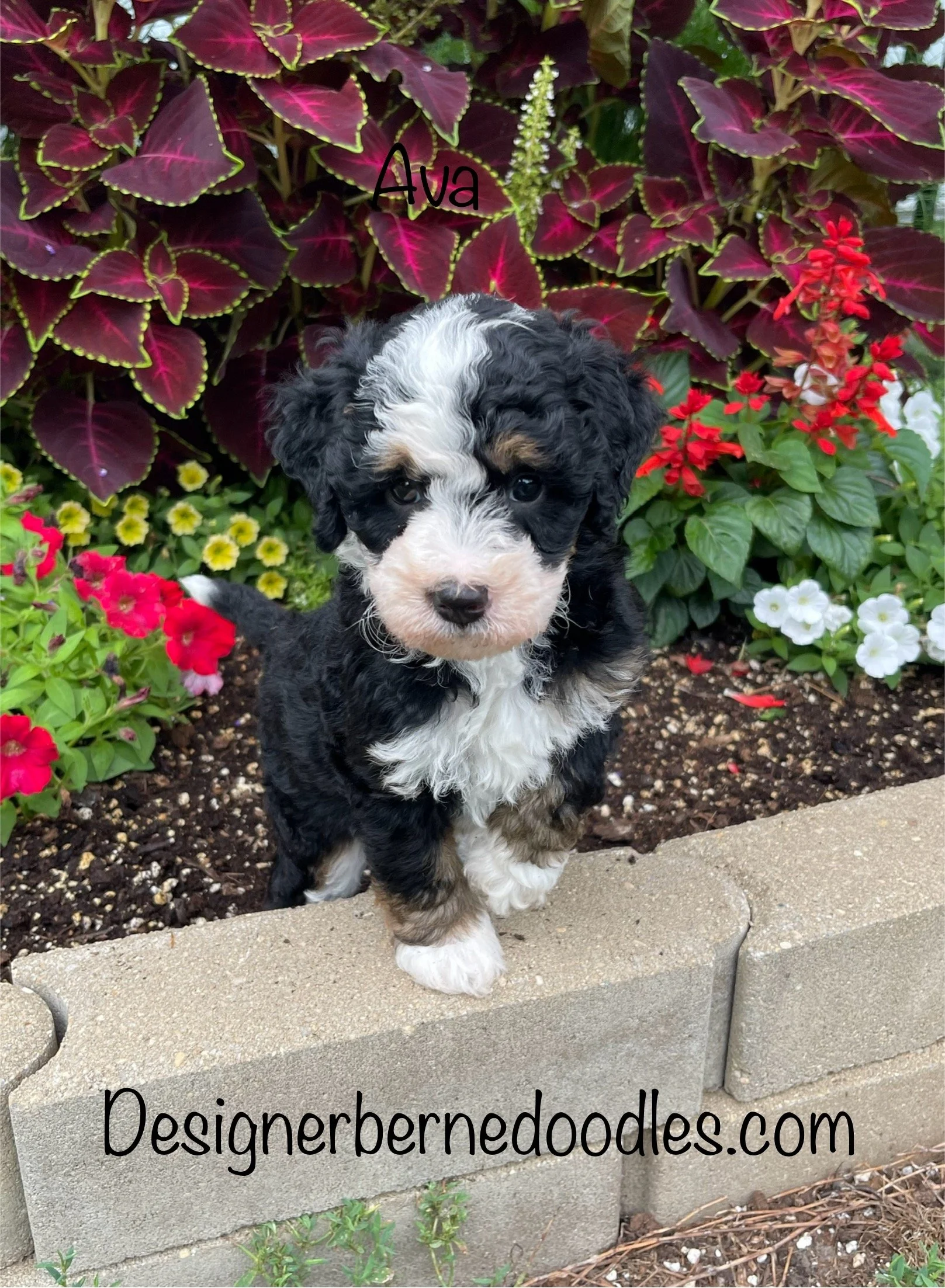 Ava 3234 has found her forever home with Sandy Trowbridge from Tonganoxie, KS. She is a gorgeous Tri Color F1b Tiny / Toy Bernedoodle born Saturday June 21st 2025, She will be 8 weeks old and ready to go home as early as Saturday August 16th. Her parents are Daisy & Prince. Daisy weighs 40lbs and Prince weighs 10lbs. Estimated weight is between 15 & 30 Lbs full grown.