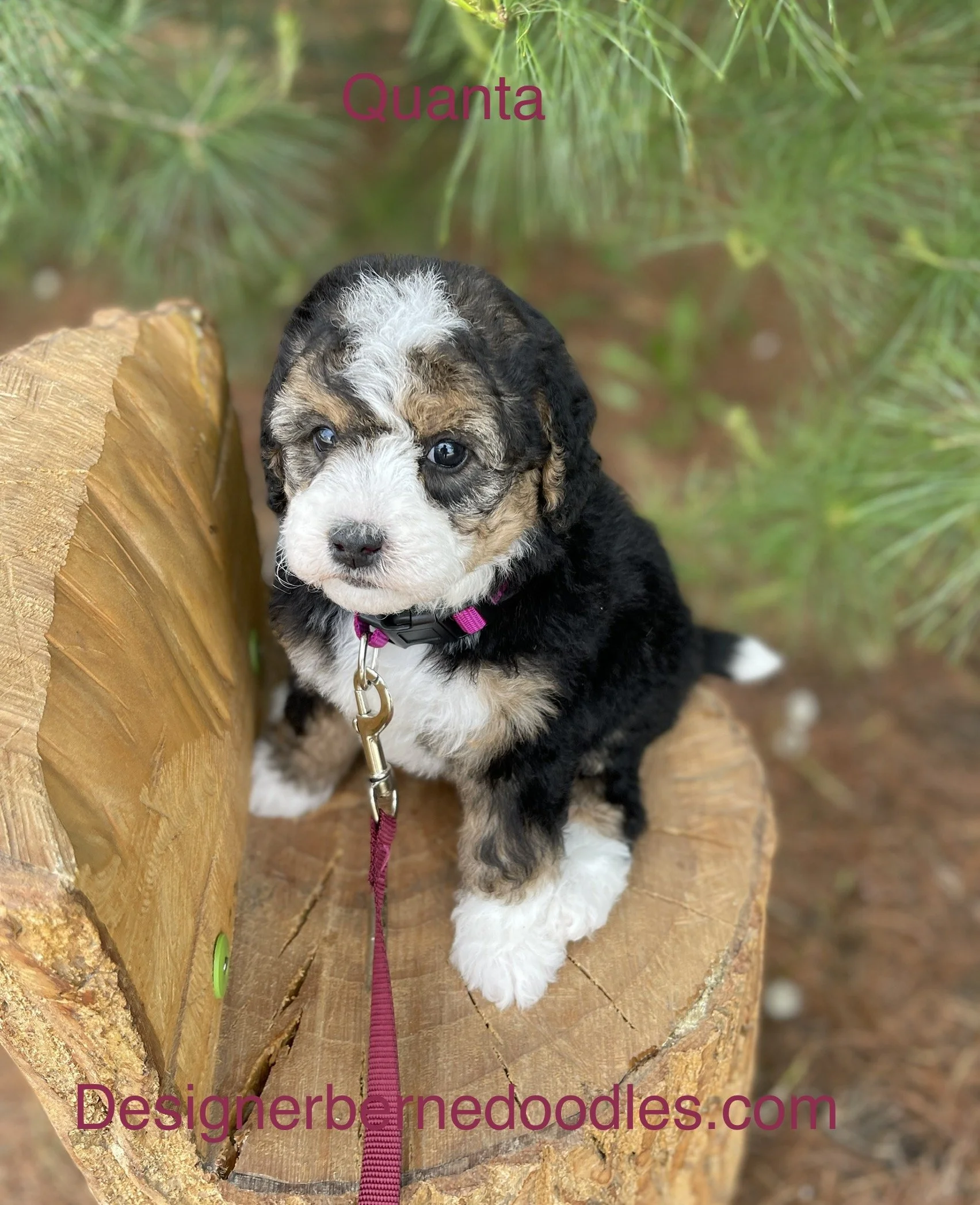 Jameson 1166 formerly Quinta has found her forever home with Doug Haling & family from Woodstock GA, She is a gorgeous Black & white Tri Color F1b Tiny / Toy Bernedoodle born Tuesday June 24th 2025, She will be 8 weeks old and ready to go home as early as Tuesday August 19th. Her parents are Fiona & Banjo. Fiona weighs 23lbs and Banjo weighs 17lbs. Estimated weight is between 15 & 20 Lbs full grown.