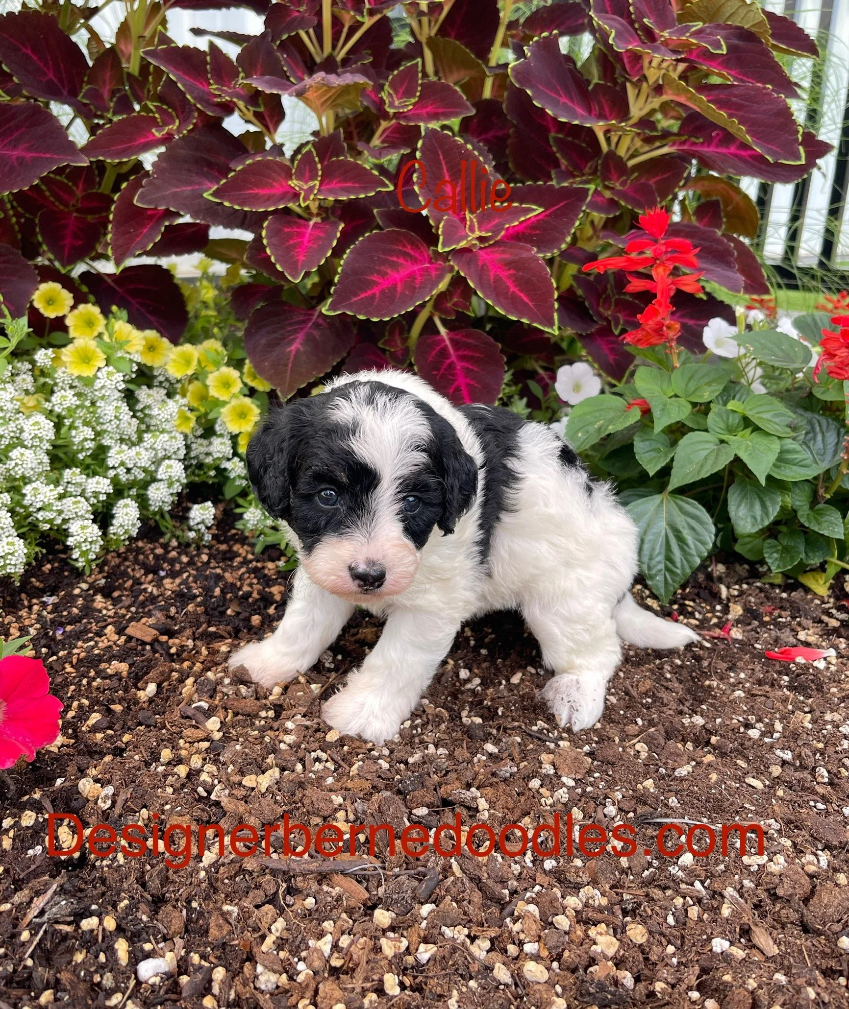 Callie 0869 has found her forever home with Mariola Kabat & Jeff Barnewolt from Brimfield IL. She is a gorgeous Tri Color & White F1b Tiny / Toy Bernedoodle born Saturday June 21st 2025, She will be 8 weeks old and ready to go home as early as Saturday August 16th. Her parents are Daisy & Prince. Daisy weighs 40lbs and Prince weighs 10lbs.