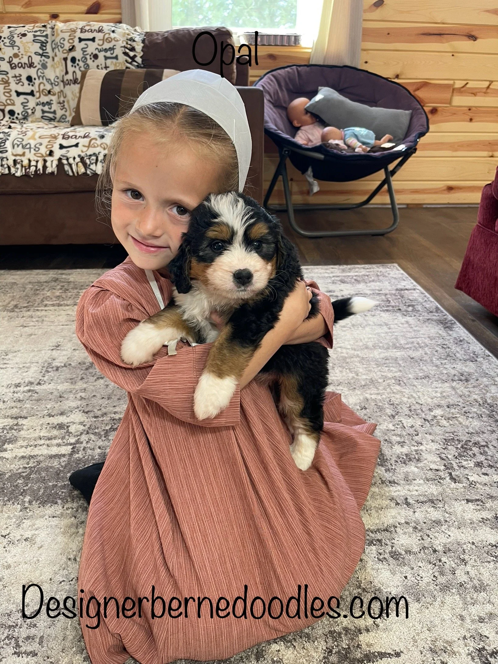 Opal 8284 is a Gorgeous Tri Color F1 Mini Bernedoodle born Thursday Sept 18th 2025, She will be 8 weeks old and ready to go home as early as Thursday Nov 13th. Her parents are Sophie & Banjo. Sophie weighs 88lbs and Banjo weighs 17lbs. Estimated weight is between 25 to 45 Lbs full grown. She is priced @ $3500. To reserve her with a $500 please text, call or email Ryan @ 2174601313. Email Designerbernedoodles@gmail.com. My venmo username is Ryan-Herschberger and my Zelle username is my email Herschy85.rh@gmail.com