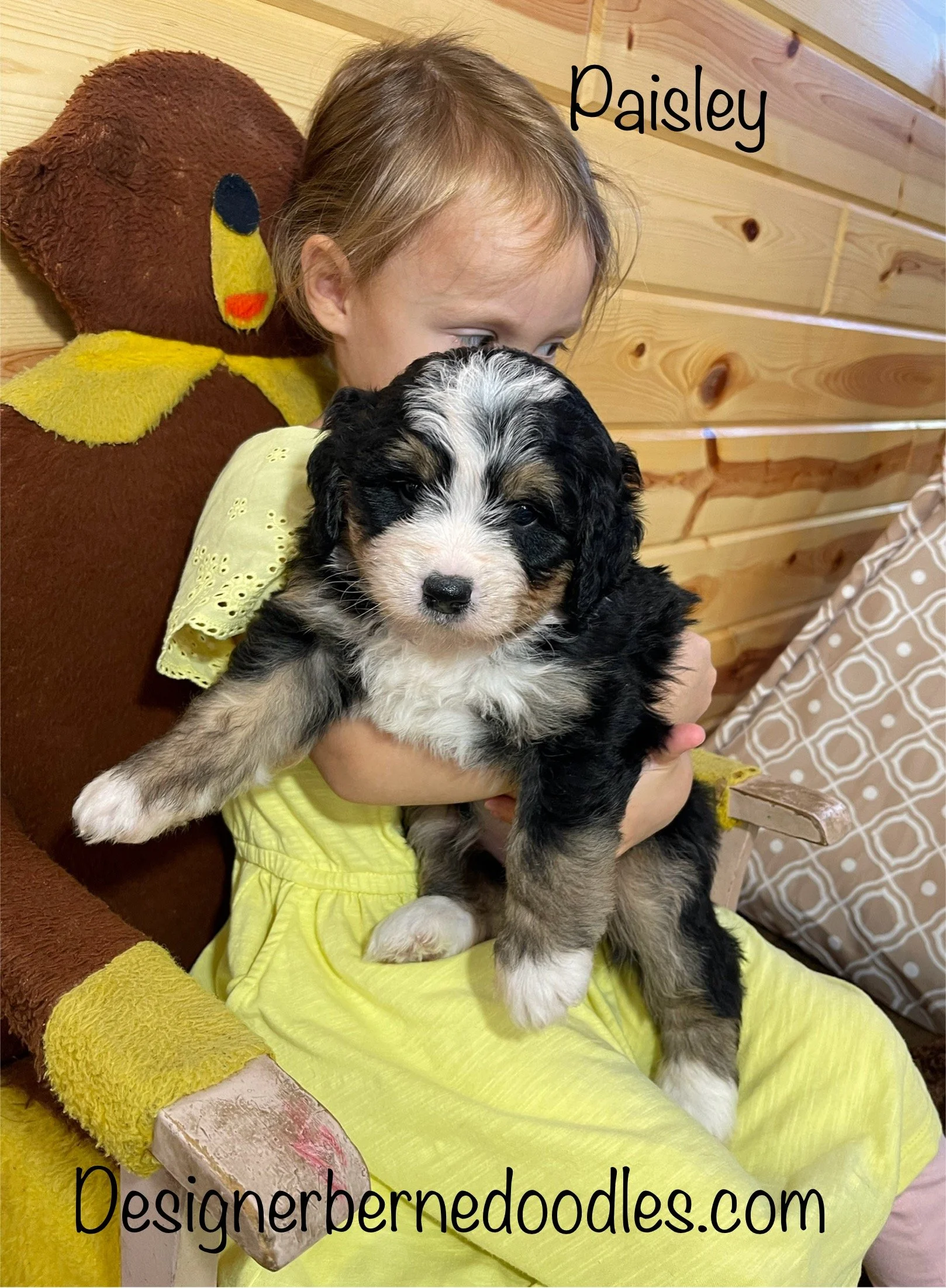 Paisley 8071 has found her forever home with David & Sheri Stadie from Hampshire IL, She is a Gorgeous Tri Color F1 Mini Bernedoodle born Thursday Sept 18th 2025, She will be 8 weeks old and ready to go home as early as Thursday Nov 13th. Her parents are Sophie & Banjo. Sophie weighs 88lbs and Banjo weighs 17lbs. Estimated weight is between 25 to 45 Lbs full grown.