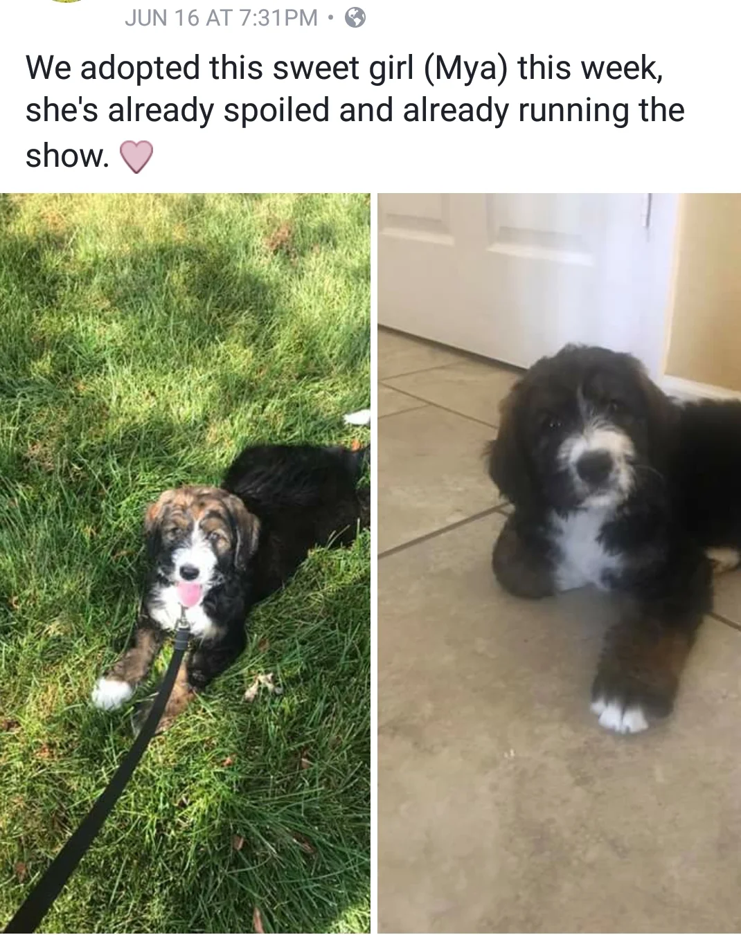 Gabby now Moxie has found her forever family with Andy and Kristie King from Carlock Il. Follow her on instagram @ Moxiethebernedoodle