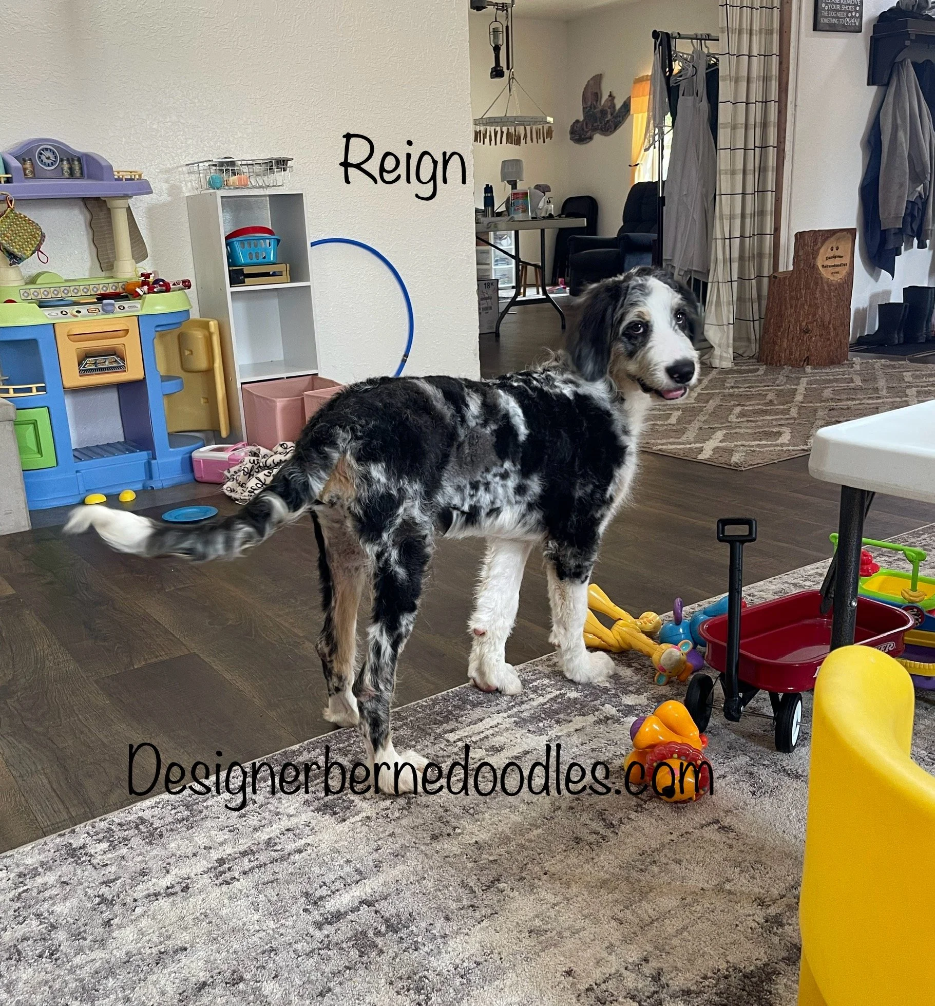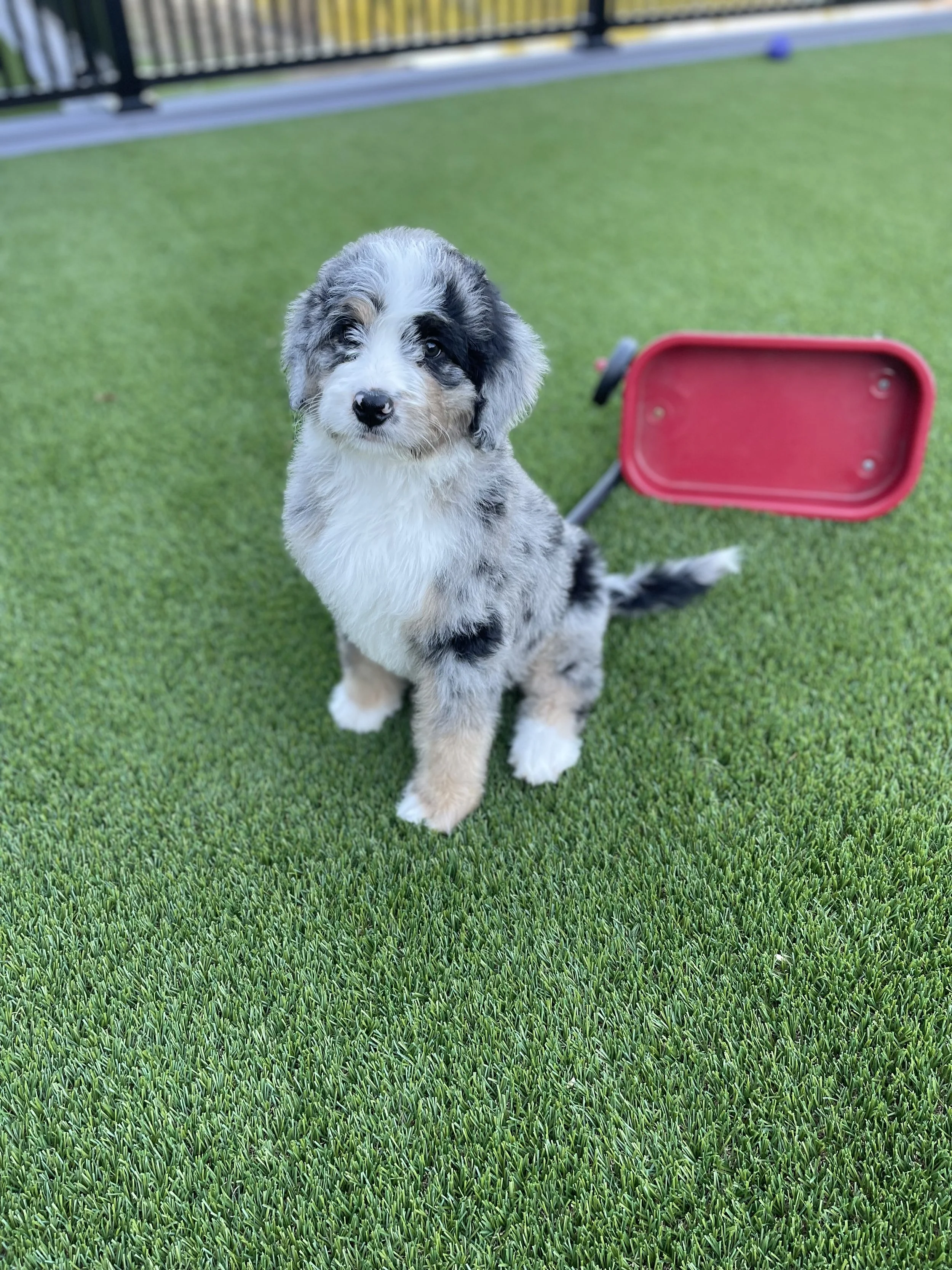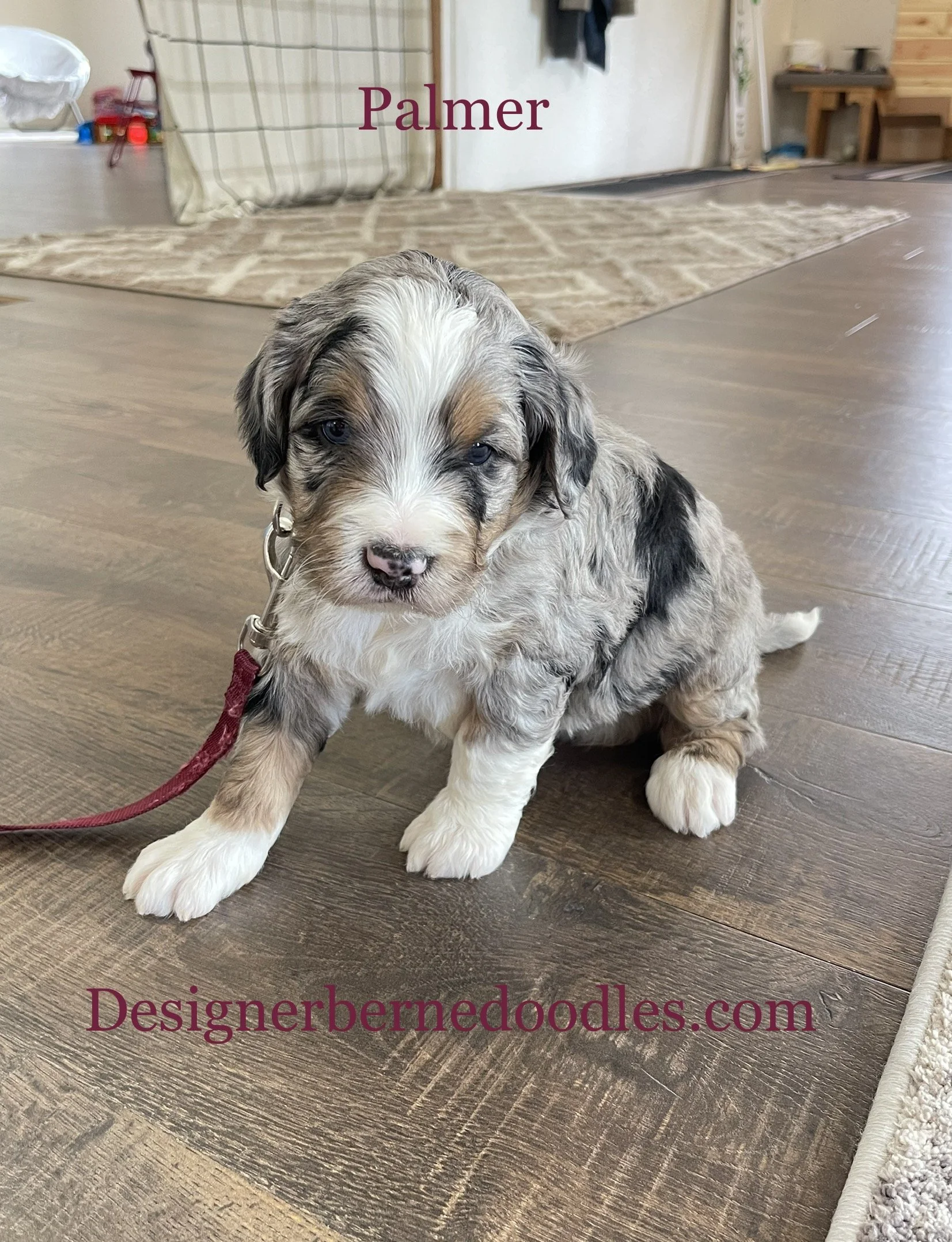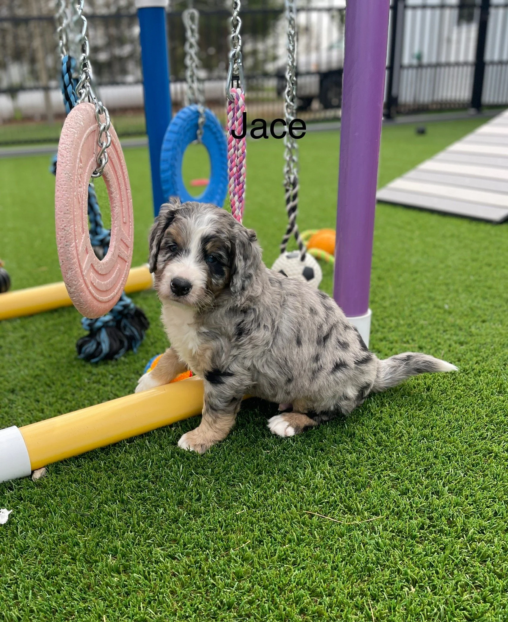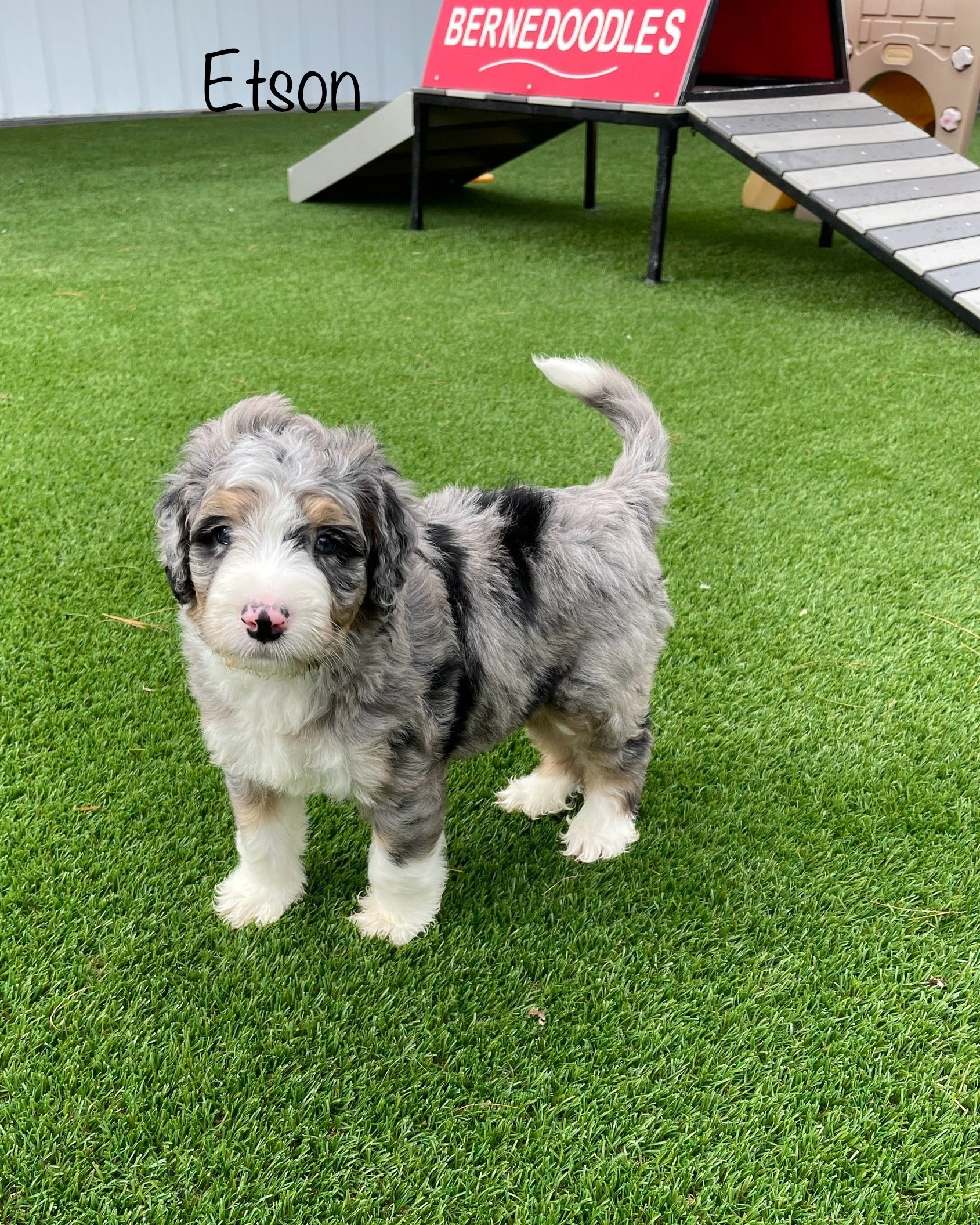 MoJo formerly Jace 7763 has found his forever home with Ella Weidner from Los Angeles CA is a handsome Blue Merle F1 Standard Bernedoodle born Feb 24th and is available to go home as early as April 21st. His parents are Crystal & Ty.