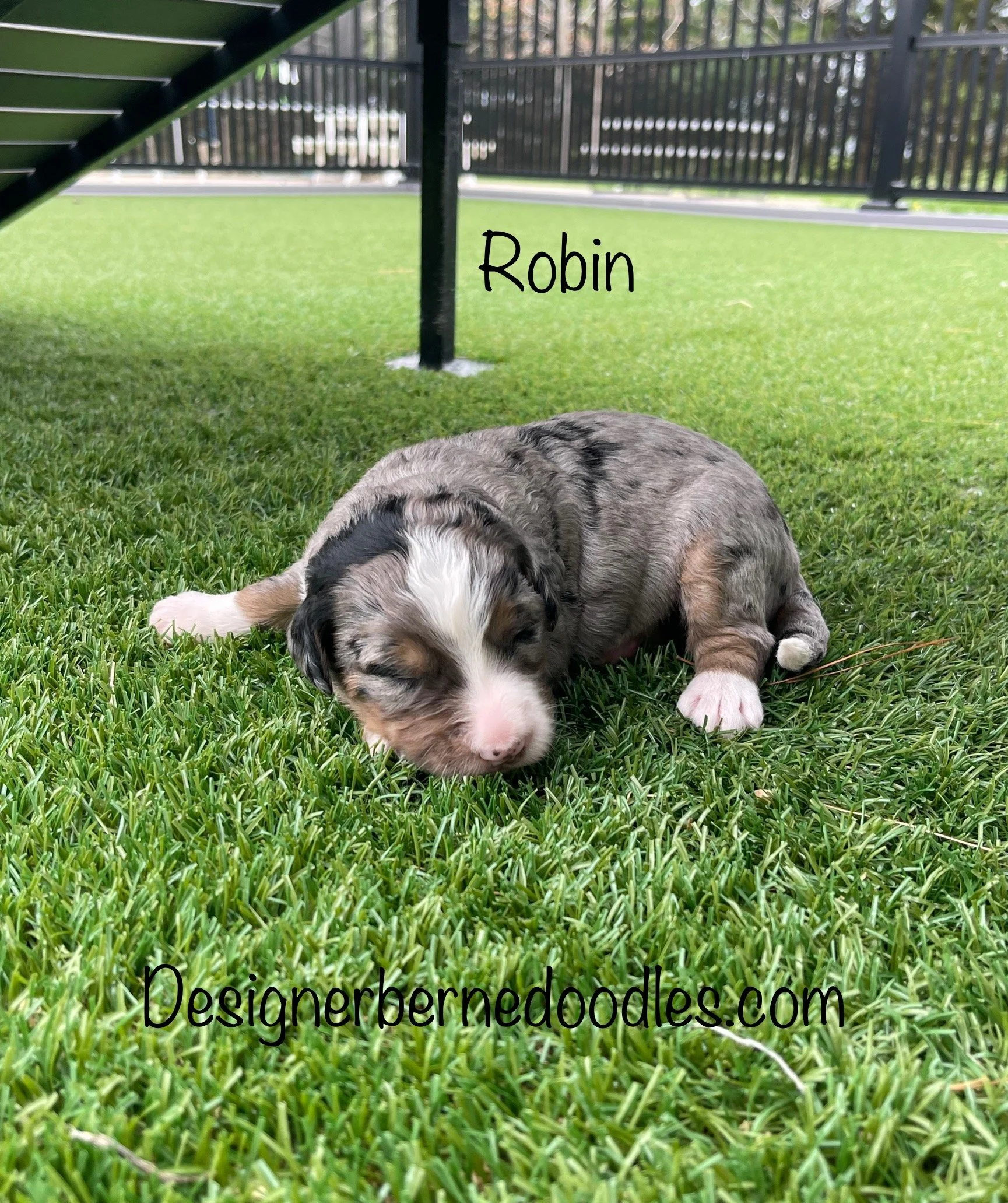 Robin is a gorgeous F1 Blue Merle Standard Bernedoodle born Wednesday April 1st 2026, She is ready to go home as early as Wednesday May 27h! Her parents are Crystal & Ty . Crystal weighs 80lbs and Ty weighs 70lbs. Estimated weight is between 70 to 90 Lbs full grown. She is priced @ $4000. You can text call or Email Ryan @ 2174601313 for more info or to place a $500 deposit. My Venmo username is Ryan-Herschberger or my Zelle username is my email Herschy85.rh@gmail.com